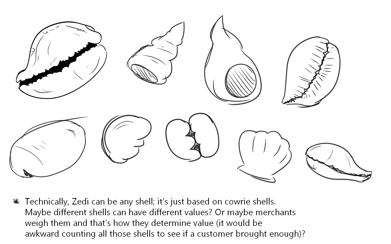 Zedi are shells that are the currency in the world of Zakumba: Astraia. They’re naturally occurring, washing up on Zakumbaland shores in relatively similar quantities every morning. These shells are then gathered and traded across the other regions.